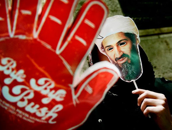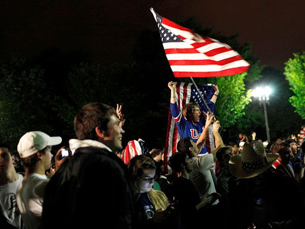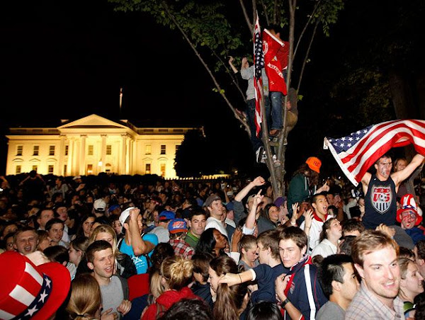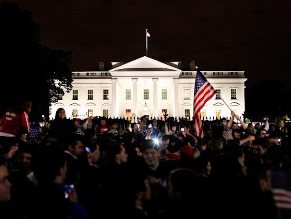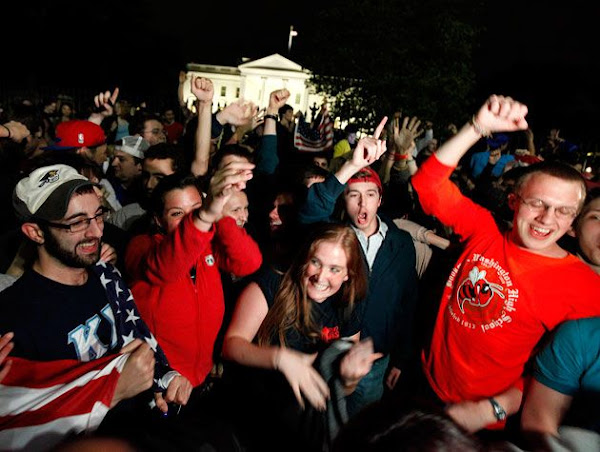 A crowd outside the White House in Washington, cheers Sunday, May 1, 2011, upon hearing the news that terrorist leader Osama bin Laden is dead.